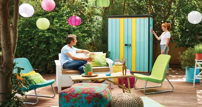 Oakland Gartenhaus aus UV-beständigem Polypropylen. Maße: 229,6 x 253 x 125 cm (Breite x Höhe x Tiefe), Gesamtfläche: 2,4 m², Stärke: 20 mm, Dach und Boden aus Polypropylen inklusive. Das Gartenhaus ist als Lagerraum im Freien konzipiert und verfügt über eine Doppelschwingtür mit Schloss für zusätzliche Sicherheit sowie zwei Fenster aus Polycarbonatglas. Es kann auf einer 2,20 x 1,35 Meter großen Betonplatte aufgestellt werden.
