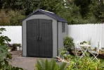 Der Premier 757 Gartenschuppen aus Kunstharz in Grau eignet sich ideal zur Aufbewahrung von Gartengeräten und Zubehör aller Art. Er hat eine Grundfläche von 4,6 m². Die extrem robusten Doppelwände sorgen für maximale Haltbarkeit und Stabilität. Er hält jedem Wetter stand, von starkem Regen bis hin zu Wind. Das Dach hält Schneelasten stand, und der robuste Boden schützt den Innenraum vor Schlamm und Regen. Er verfügt außerdem über einen integrierten Türriegel, abschließbare Doppeltüren, ein Fenster und ein Dachfenster. Er ist UV-geschützt und rostet, verrottet, verbeult oder blättert nicht ab. Maße: 229 x 252 x 223 cm (Breite x Höhe x Tiefe).