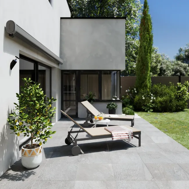 Terrassenmarkise Nori mit integrierter Kassette, motorisierte Öffnung, grau, 4,95×3,5m